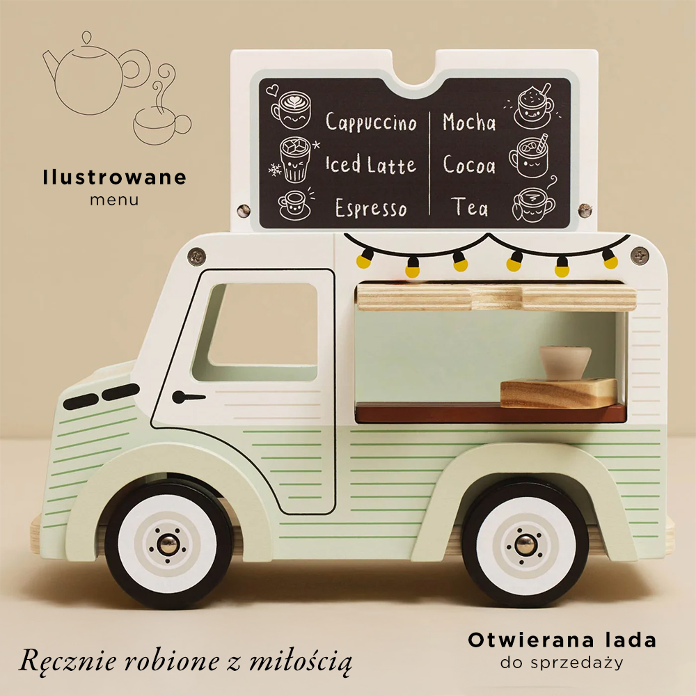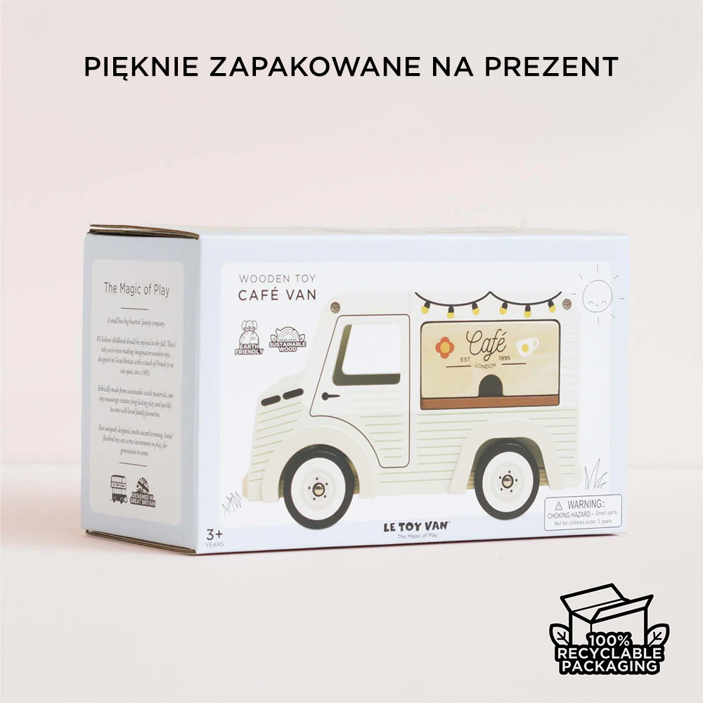 Kawiarnia w stylu retro jest wyposażona w podnoszony dach z menu, słodkie okienko do podawania kawy i herbaty, markizę oraz drewnianą tacę do serwowania. Jej rozmiar idealnie pasuje do gamy drewnianych lalek, akcesoriów oraz pięknych, wielokrotnie nagradzanych domków dla lalek marki Le Toy Van. Czas spędzony z tym klasycznym, miniaturowym samochodzikiem - kawiarnią jest najsłodszy!